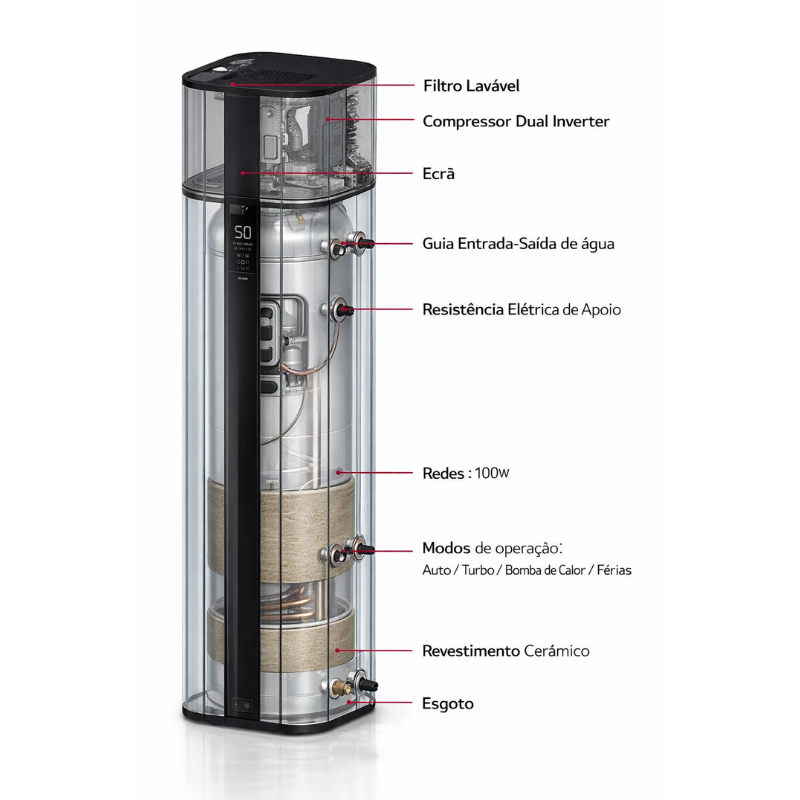 A Bomba de Calor AQS Monobloco da LG é uma solução moderna, eficiente e ecológica para aquecimento de águas sanitárias, concebida para substituir sistemas convencionais como caldeiras elétricas ou a gás. Desenvolvida com tecnologia avançada Dual Inverter, garante um desempenho superior, menor consumo energético e maior durabilidade.