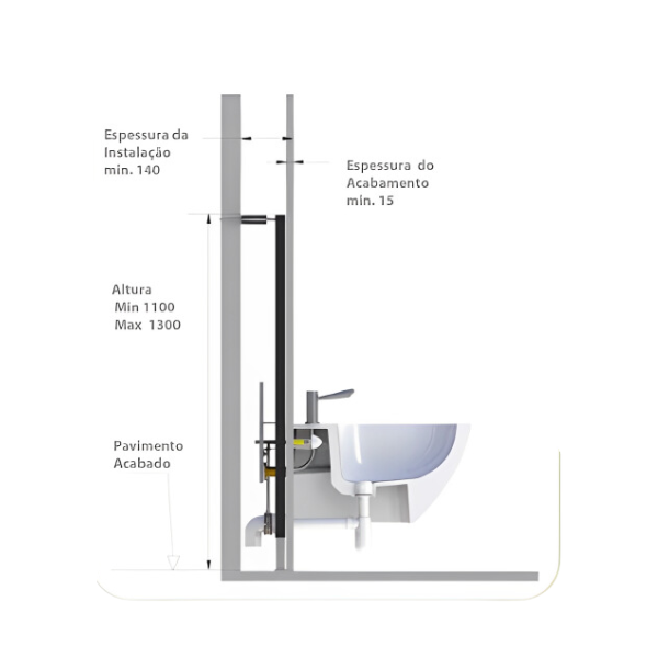 Estrutura de urinol suspenso para aplicação à frente de paredes de alvenaria e acabamento em parede ligeira ou em calha técnica de suporte para paredes ligeiras.