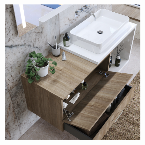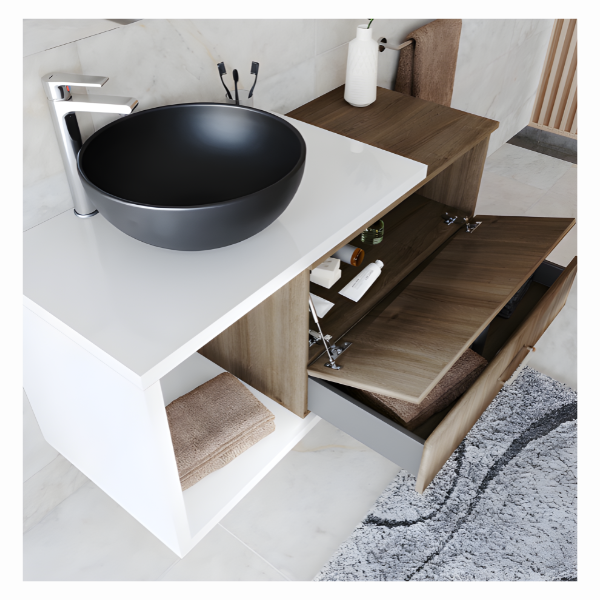 Design moderno e elegante. Composto por uma gaveta e uma porta com fechos amortecidos, que proporcionam um espaço de arrumação eficiente para produtos de higiene pessoal.