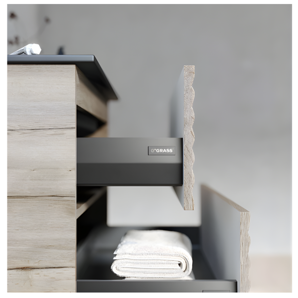 Design moderno e elegante. Possui puxadores rebaixados no móvel e é composto por duas gavetas GRASS® com fecho amortecido.
