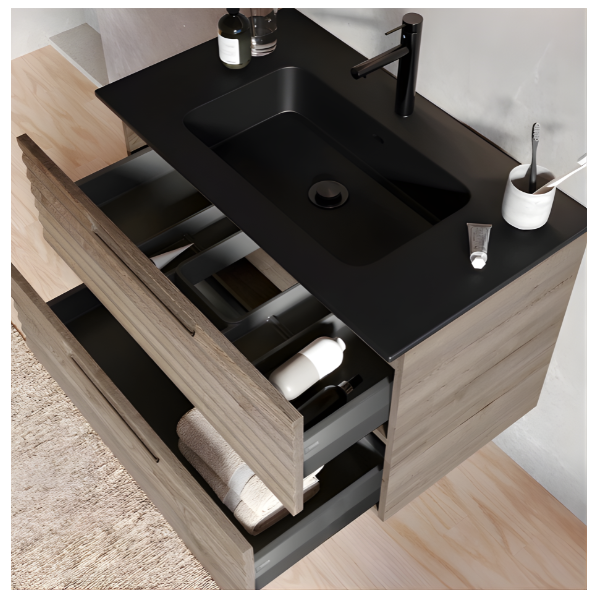 Inclui um organizador na primeira gaveta, oferecendo um espaço eficiente para guardar produtos de higiene pessoal.