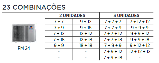 A Gree FM24 é uma unidade exterior modular para sistemas multisplit que permite até 2 unidades interiores diferentes, resultando em até 8 combinações possíveis com unidades de parede, cassete, conduta, consola ou chão/teto