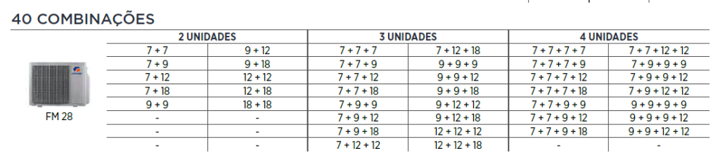 A Gree FM28 é uma unidade exterior modular para sistemas multisplit que permite até 2 unidades interiores diferentes, resultando em até 8 combinações possíveis com unidades de parede, cassete, conduta, consola ou chão/teto